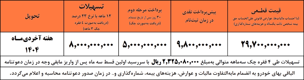 | موعد تحویل خودرو | هفته آخر دیماه ۱۴۰۴ |
